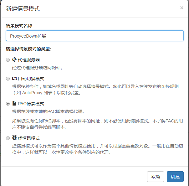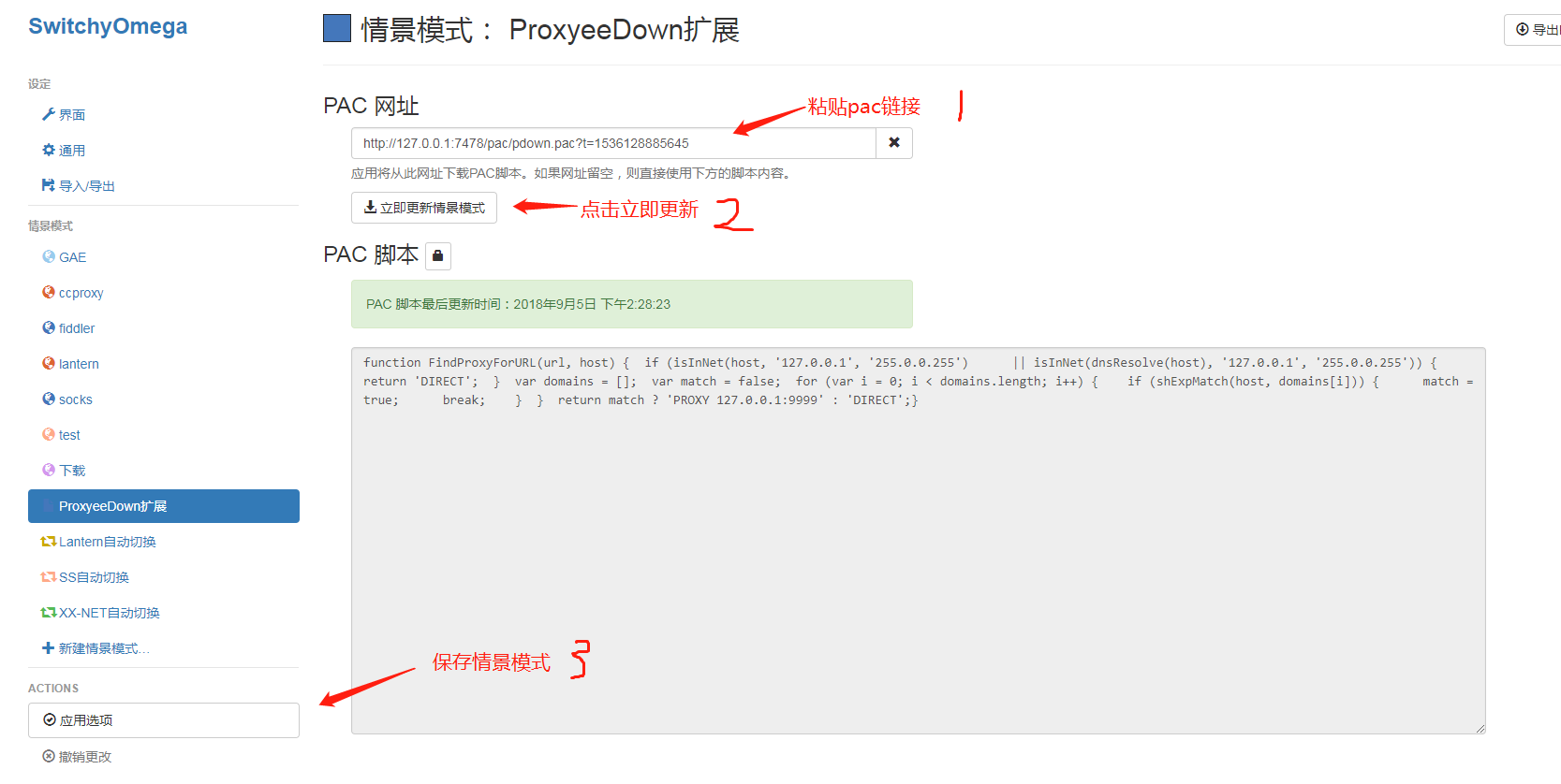 - 把复制的 PAC链接粘贴进来并点击立即更新情景模式然后保存